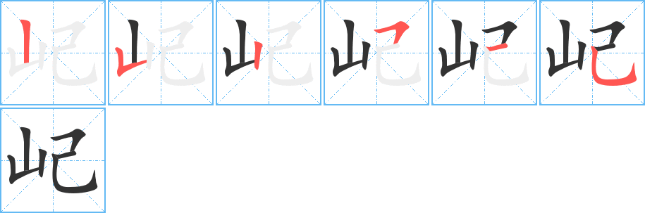 “屺” 字共有 6 画,笔画顺序为:竖、竖折/竖弯、竖、横折、横、竖弯钩