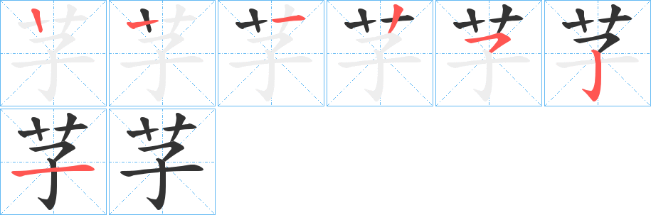 “芓” 字共有 6 画,笔画顺序为:横、竖、竖、横撇/横钩、竖钩、横