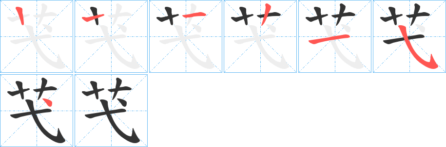 “芅” 字共有 6 画,笔画顺序为:横、竖、竖、横、斜钩、点